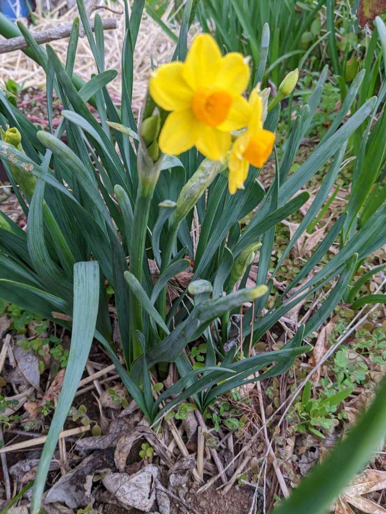 黄色水仙。東側入口付近です。庭が広いから、アチラコチラ〜水仙の芽が出てきてます。🤔🙄😱今では、白色が出てくるのか黄色が出てくるのか、解らない程です。😅🌼💐☀️🥳