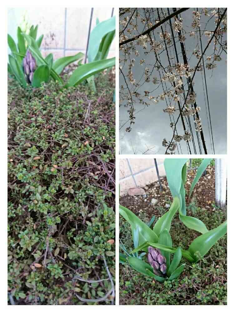 タイムの下から 昨年植えっぱなしにしてしまった ヒヤシンスが咲きだし ミニチューリップも葉を伸ばしてました