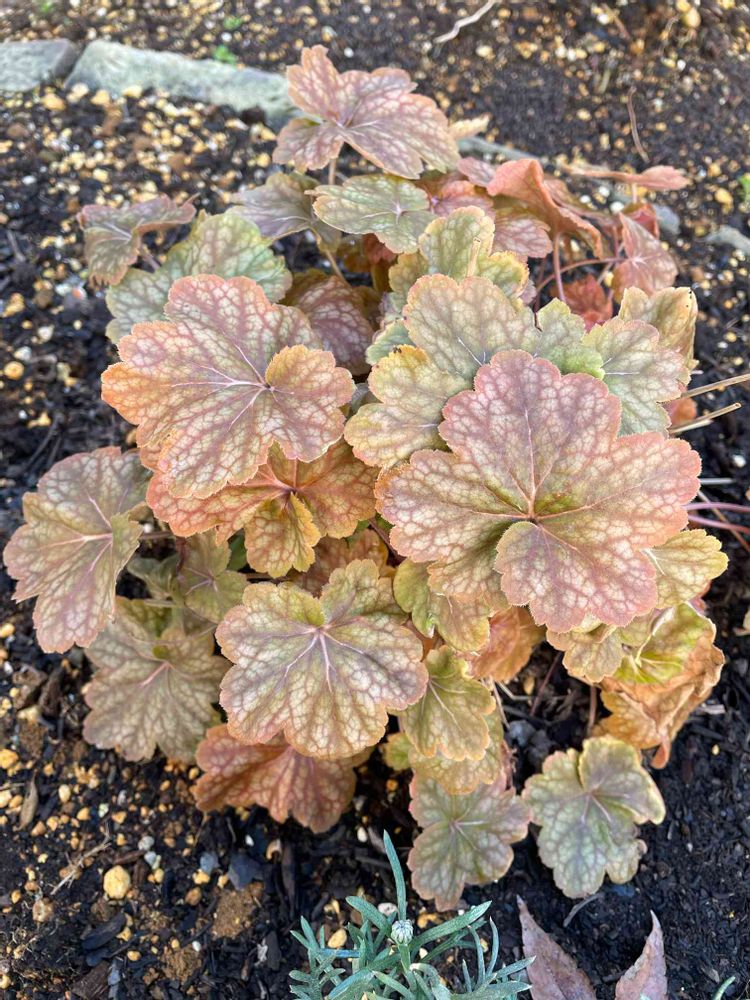 ヒューケラドルチェ バタークリーム。冬は葉っぱがやや赤みを帯びて、これもまた良き♪
