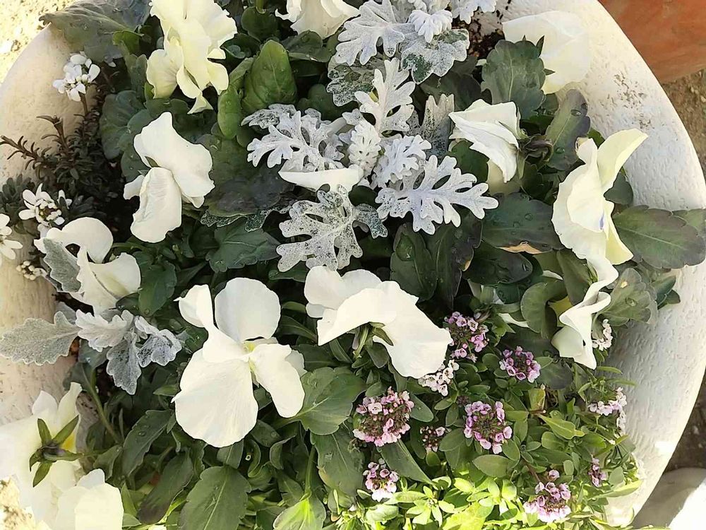 白とクリーム色であわせて作った寄せ植え。