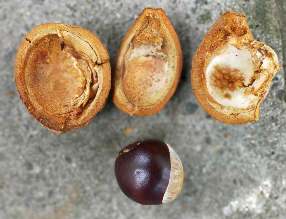 完熟したものは 果皮が3つに割れて 栗みたいな 丸っこい大きな種子が出てきます。