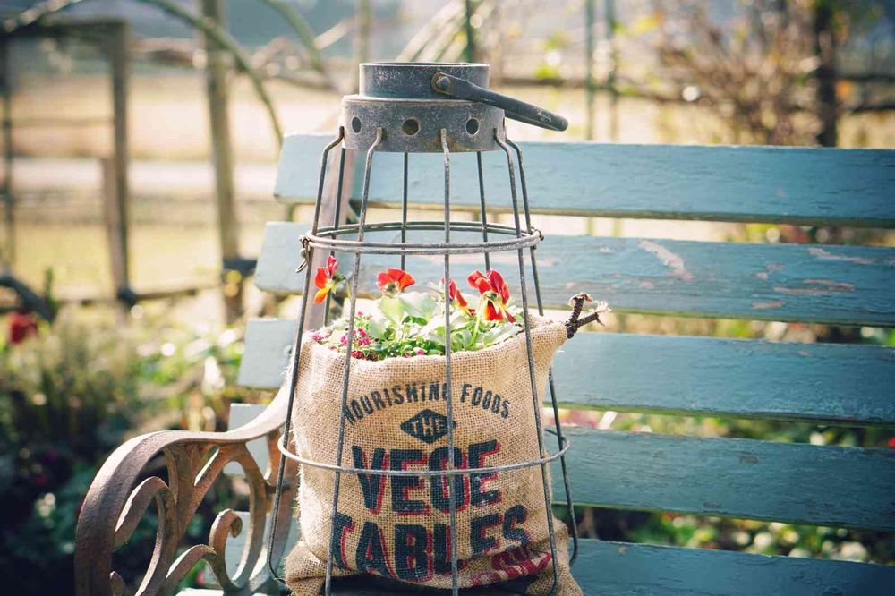 あっ♪このアイテムはランタン型の置物です。この中に100均の麻袋をセットして赤いビオラとアリッサムを植え混んでみました。春には炎のようになってくれるはずでーす♪