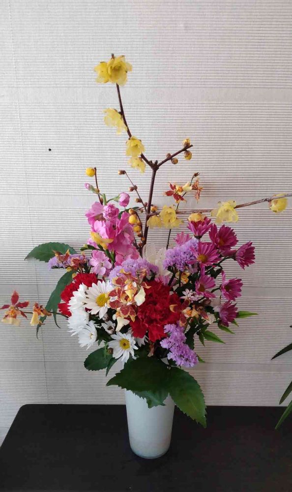 いつもの年だと、いつまでもお正月花の残り…みたいな感じなんですが、今年はいただいたお花と庭で咲いたロウバイが入ってるから、ちょっと華やか、かな🤭