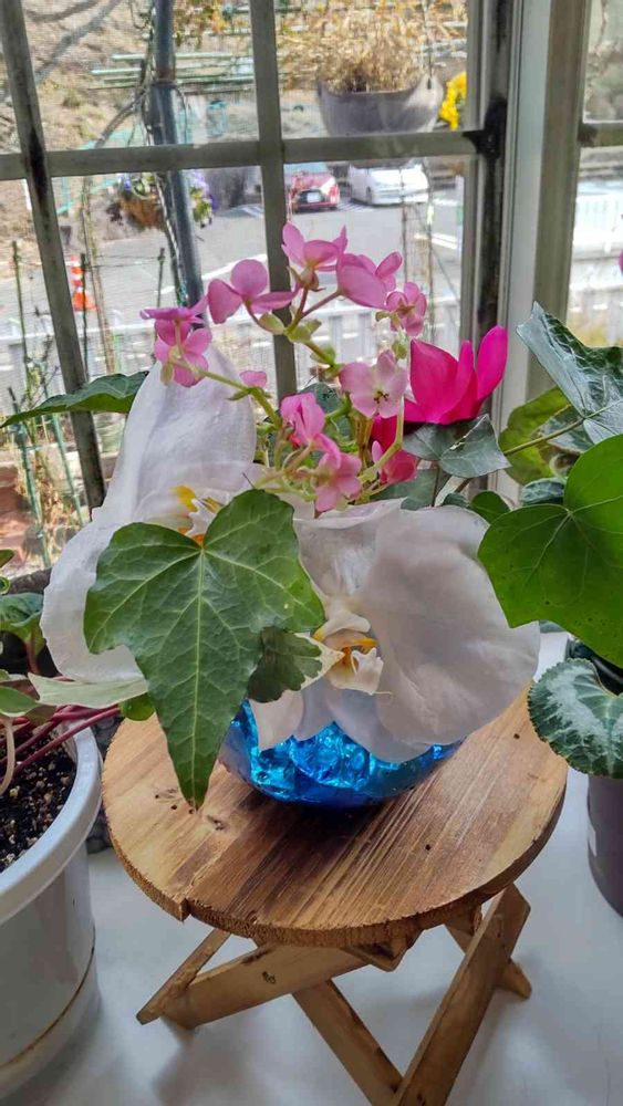 もう随分クタってなってるけど、短くカットして、ヘデラやベゴニアラブ・ミーと一緒に、青いガラスのボールに💙