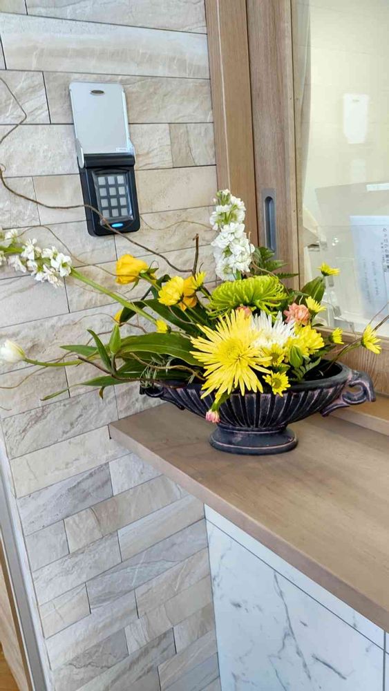 2月になりました。こちらのフラワーアレンジメントは勤務先のです。キクが主役の器が素敵な作品です👍器好きなためそっちに目がいくんですよね(笑)