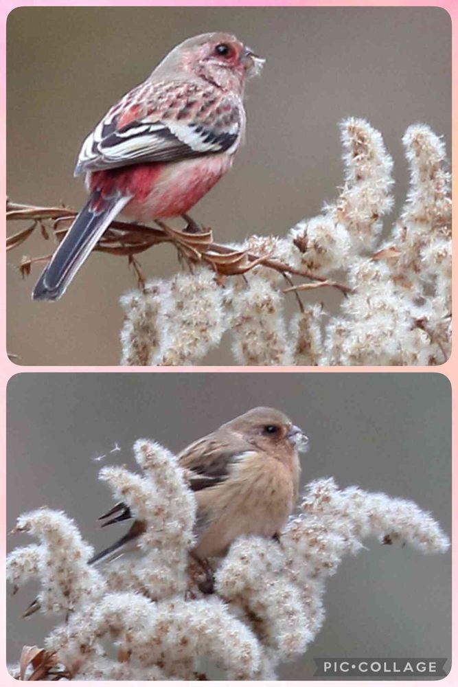 わぁ〜、仲良しベニマシコさん、口にモフモフいっぱい入ってそう…。モフモフごと全部呑み込んじゃうんでしょうか。セイタカアワダチソウは美味しいのかな〜。🤔