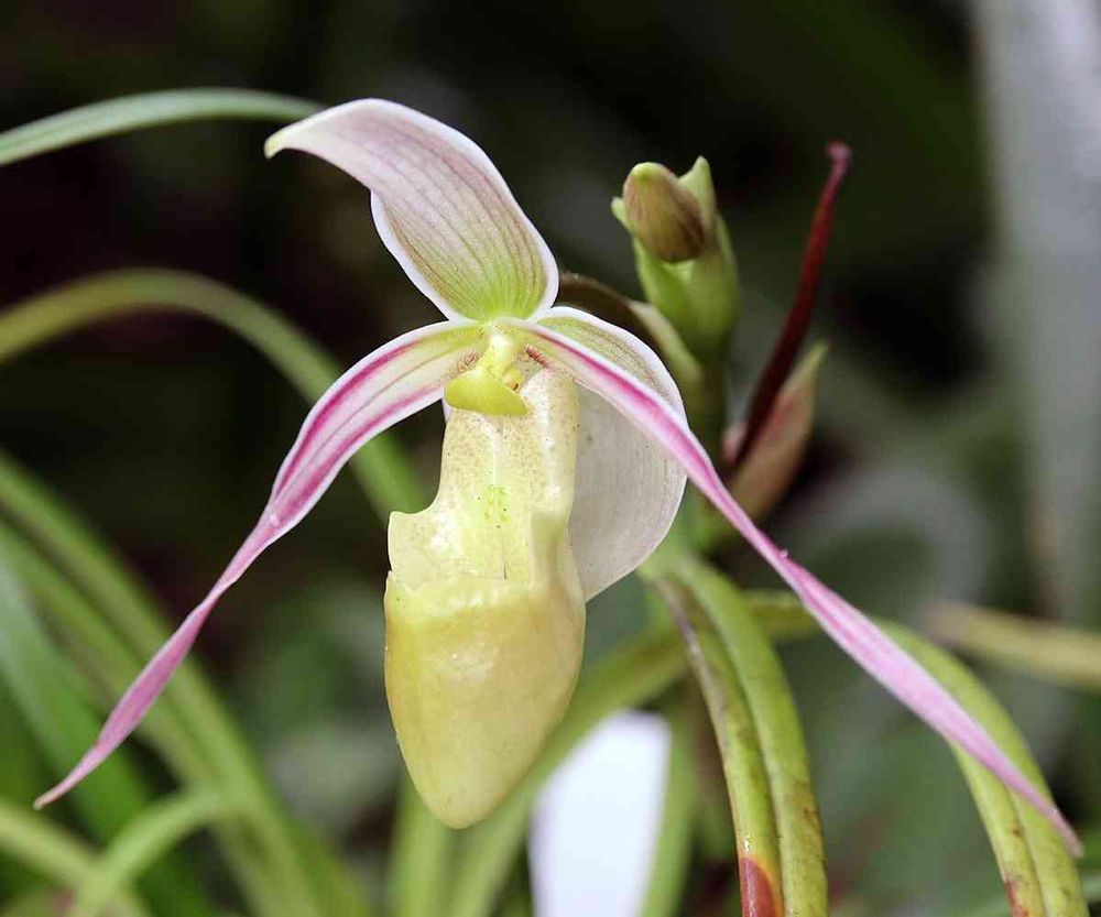 淡い黄緑色の花で、花弁に紫色と白色の縞模様が入り、横に伸びる。