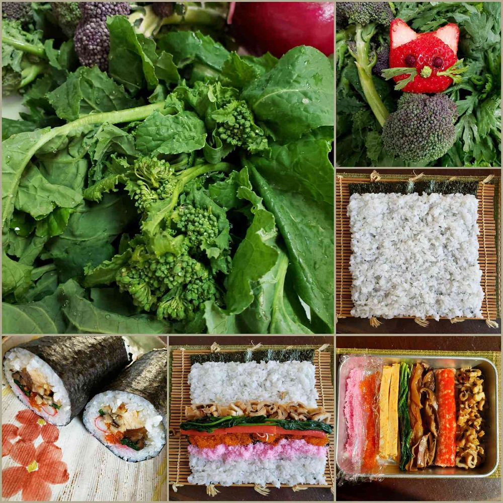今回は卵焼き、ほうれん草、椎茸、かんぴょう、穴子、とびっこ、でんぶ、カニかまです!うなぎやキュウリのときもあります~💦