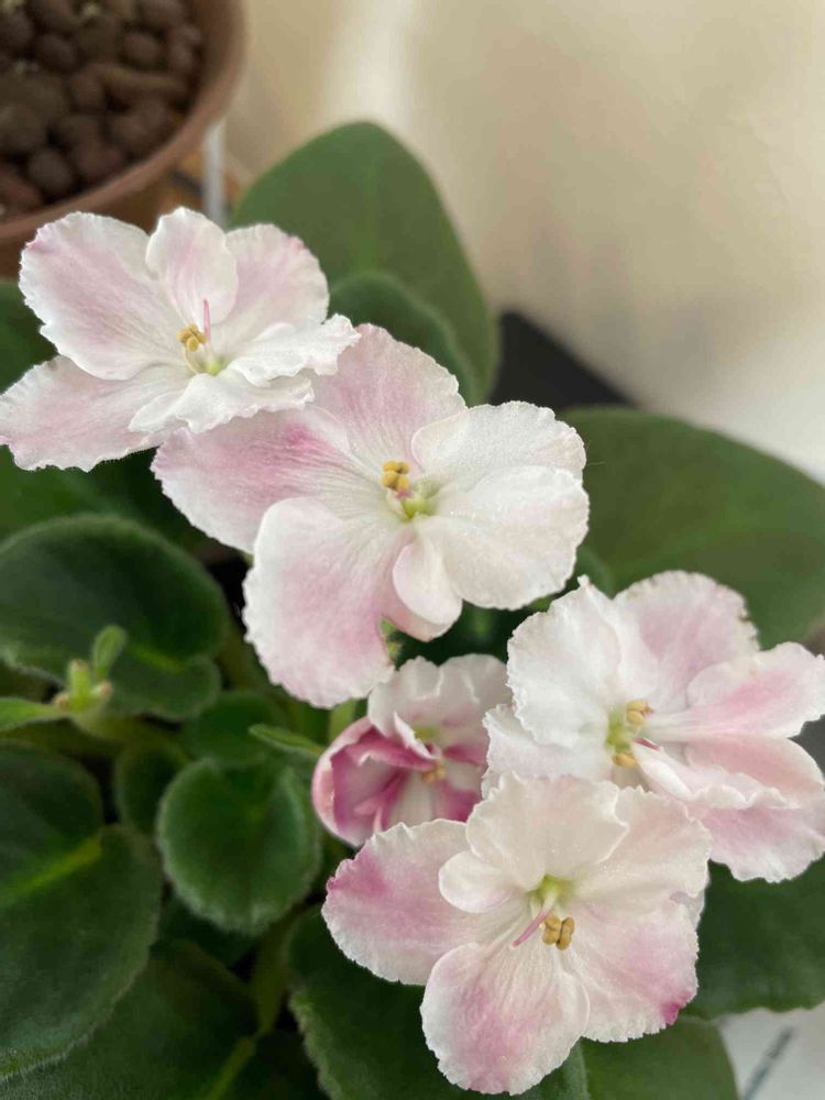 片手サイズのセントポーリア。控えめな花も良いですが、フサフサした肉厚の葉っぱもなかなかヨイです。花びらは細かいラメが入っていて、不思議です。