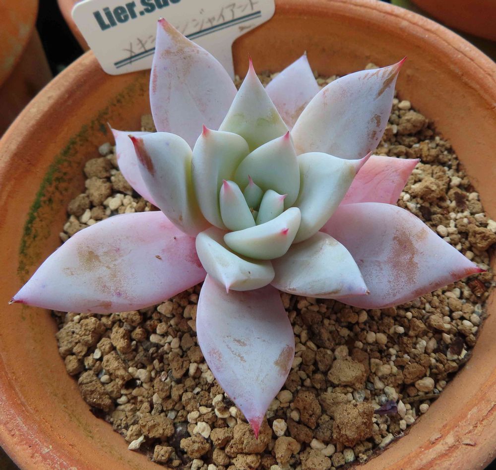 全部の葉が白っぽい状態が続いていたけど,ここに来て少しだけ色付いてきた。いずれもごく淡い色だけど,成長点近くの葉は緑に,下側の葉はピンクに変わった。