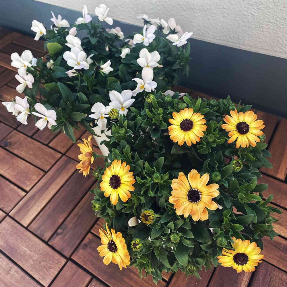 お一人様鉢のレディーララ(ビオラ)さんとオステオスペルマムさんです。
