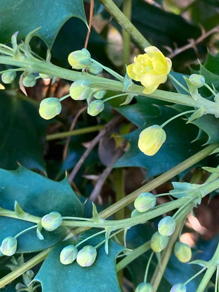 おはようございます! ヒイラギナンテン❣️ 可愛いお花と蕾🥰 昨年真理さんにホソバと違い、花枝は立ち上がらないと教えていただきました!綺麗に放射状に広がってます🤗