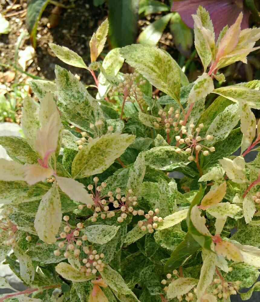 霜降りの斑入りと新芽のピンクが可愛いコデマリです💗