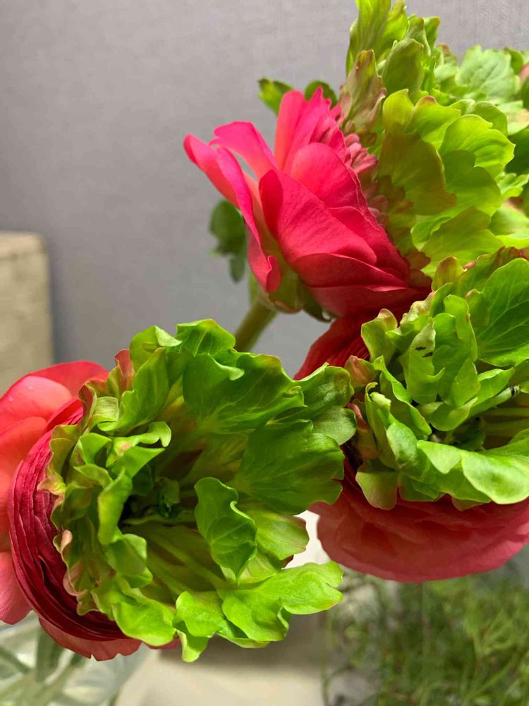 ピンクの花びらの中からグリーンがにょきにょき〜不思議ですよね〜💚