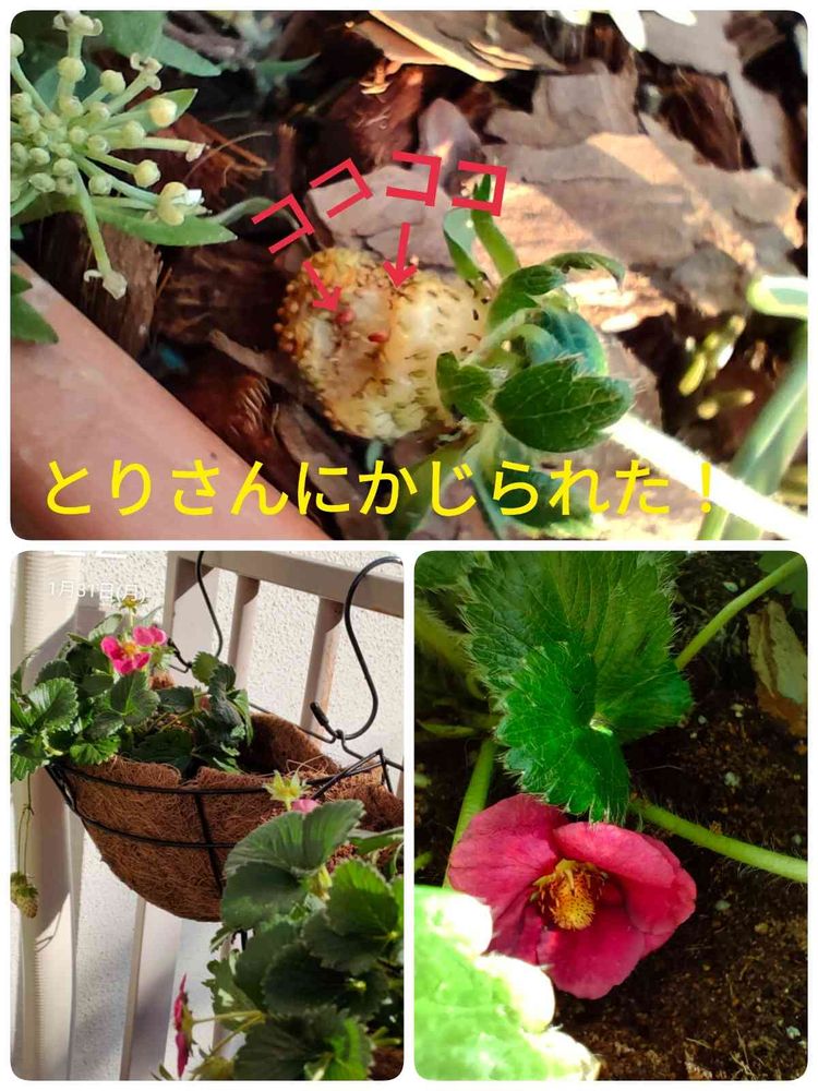 苺の実、ネットをかけて保護していましたが、見事にとりさんにやられました😱