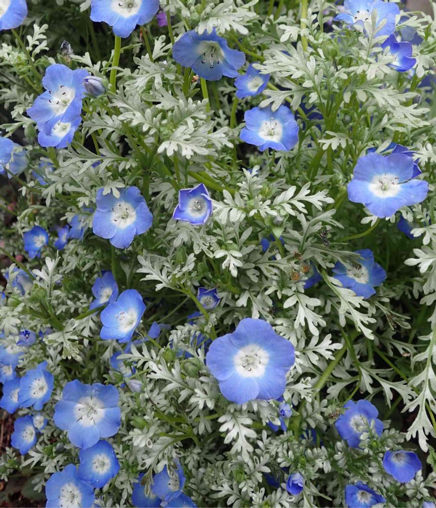 シルバーリーフのきれいなネモフィラ、プラチナスカイです💙😍🤍今はまだ咲いてないので過去写真から、これは去年の4月に撮ったものです🎶