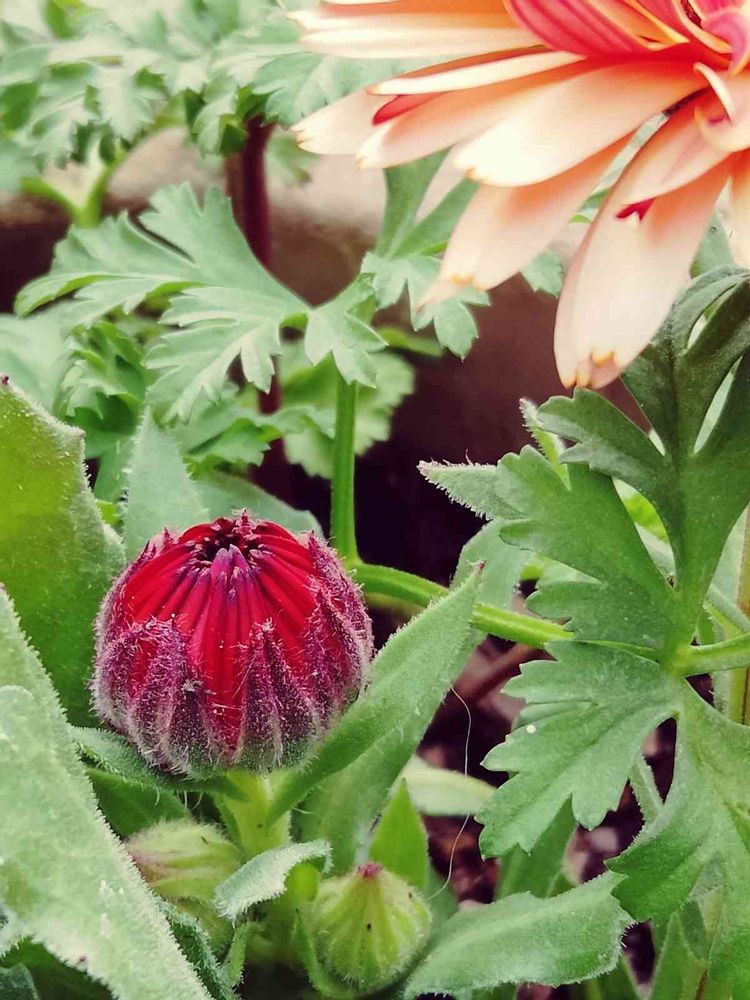 つぼみの濃い赤‼️右上のオレンジの花になるって信じられないー😍💓💓