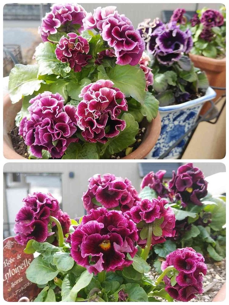 サトウ園芸さんのパンジー達😆今年も優秀で沢山蕾を持って咲き始めてきました🎶同じ種類のパンジーのように見えますが上は赤いドラキュラ。下はローブ ドゥ アントワネット ソワレという品種です。フリルの強さのちがい位しか分かりません😅何か見分け方ってあるのでしょうか…🤔
