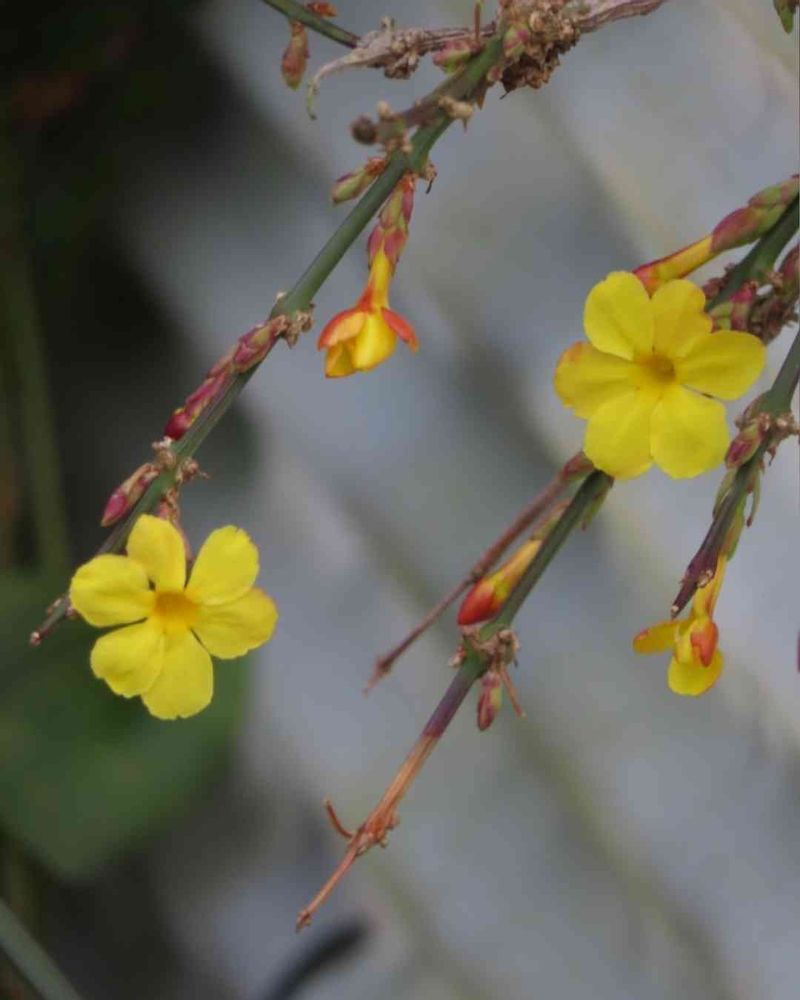 散策路沿いの庭先、オウバイ(黄梅)が美しく咲き始めていましたが、蕾は赤っぽくて可愛いかったです。