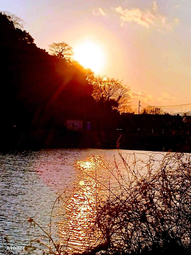 散策中、仁保川沿いでもう直ぐ日没、水面に写り込んでいる夕陽が綺麗でした。