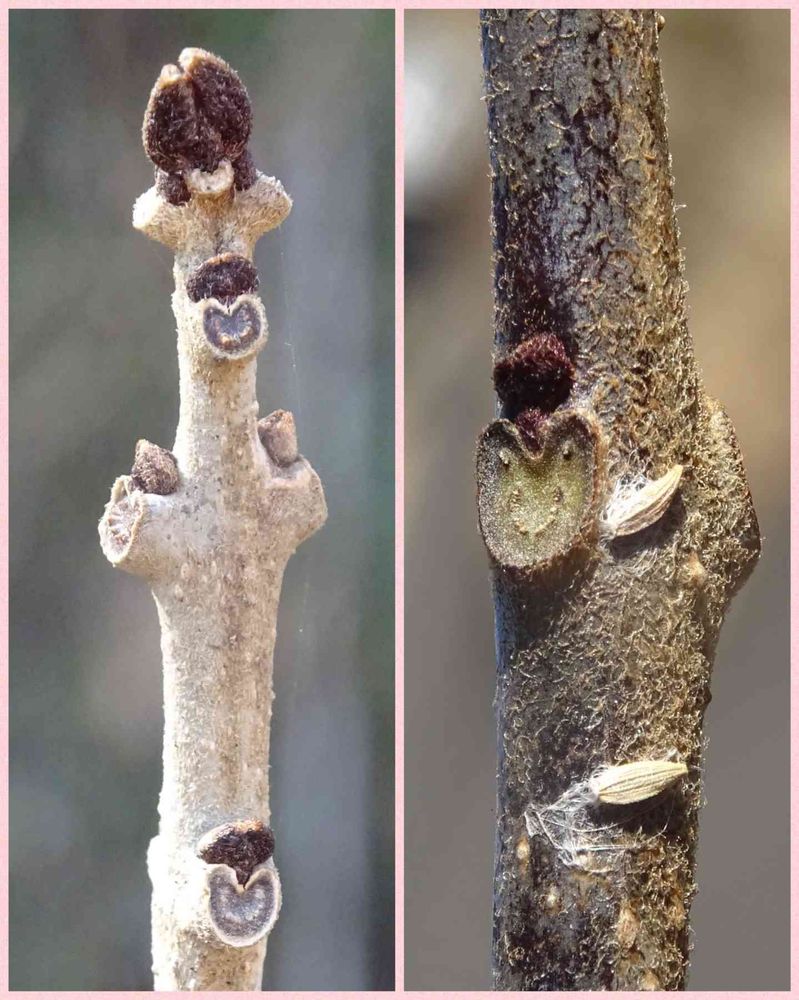 ・冬芽は裸芽で暗い赤紫色の毛が密生