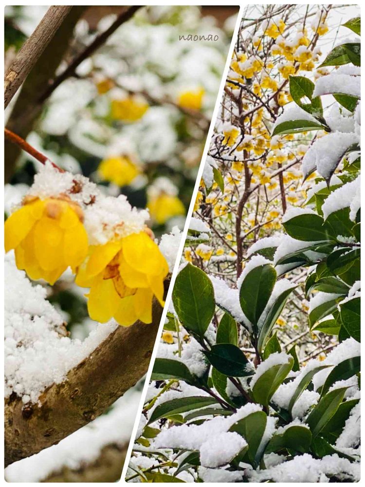我が家の中庭の蝋梅と椿も雪化粧して寒そうです🌼🌿