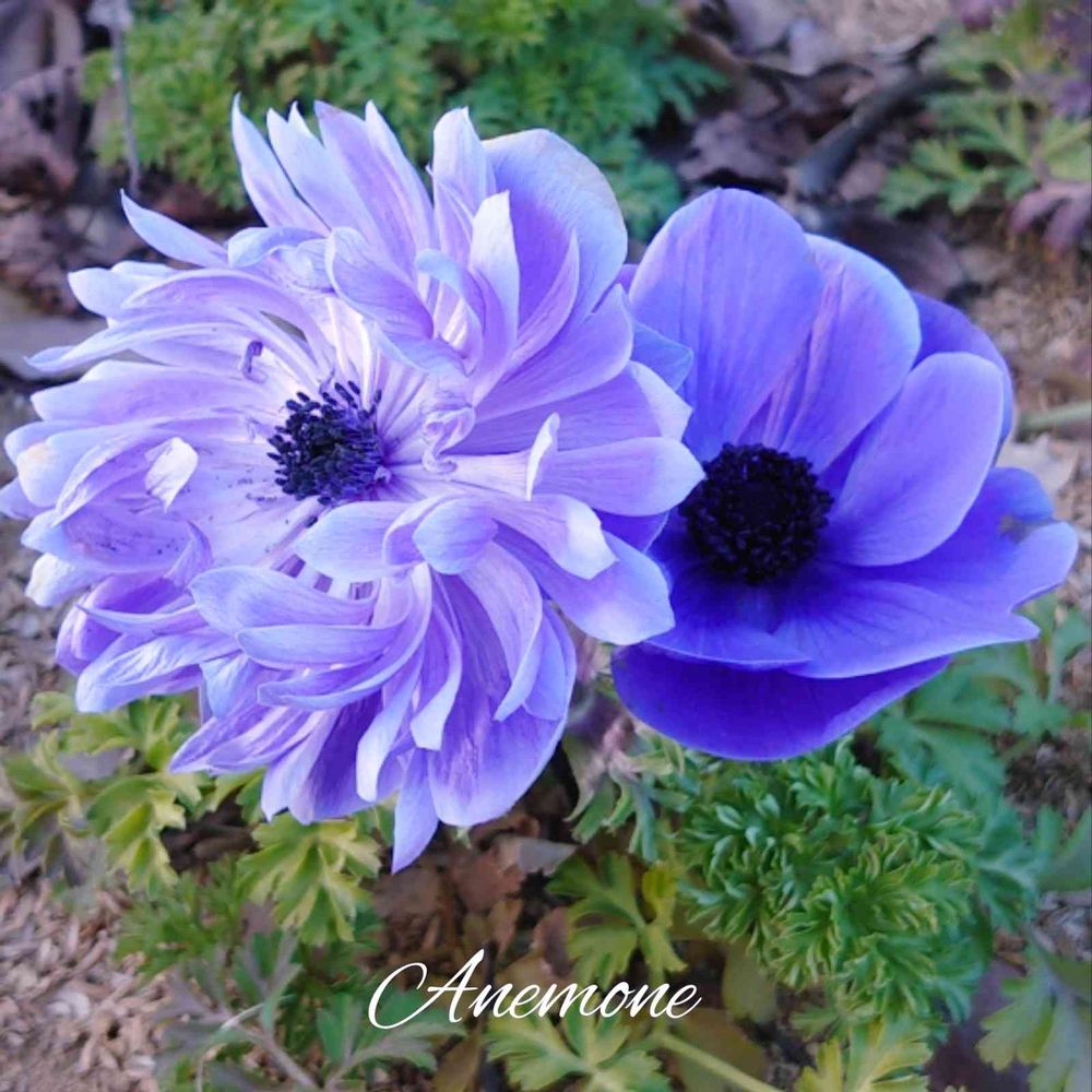八重咲きと一重のアネモネが、寄り添いながら、綺麗に咲いています💙🌿✨