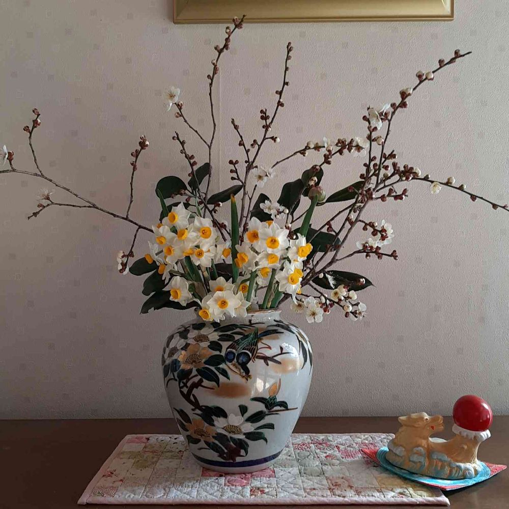白梅と水仙の生け込み華やかで、嬉しくなりました✨🎶😄💕