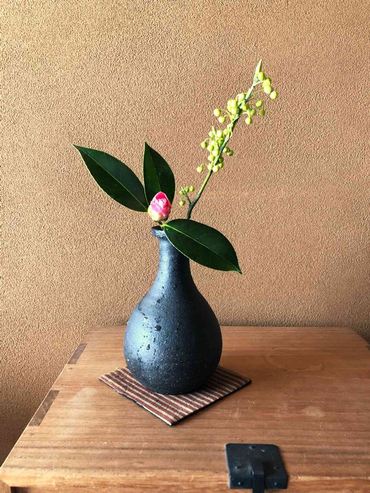 珠洲焼きの花入に雪の中で咲いていた紅侘助。