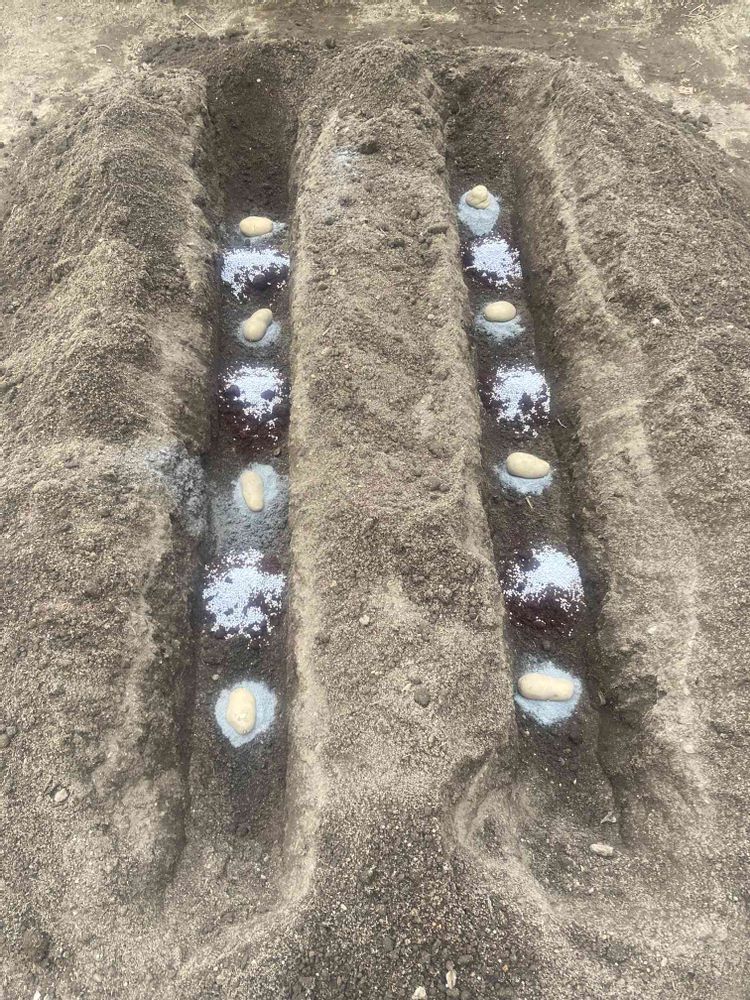 さん 下の白いのは、草木灰です❗️種芋を半分に切った面に付けてます。一袋買っていつも余るので、溝で芋🥔を置く位置の目印になるので、敷いてます❗️