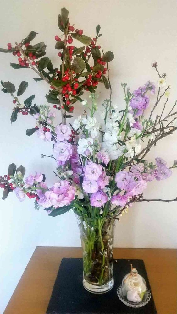 クリスマスの西洋ヒイラギとストック、梅で花をいけました🌿🌼♥️🌸🌿🌸❤️🌼🌿🌸♥️🌼🌿