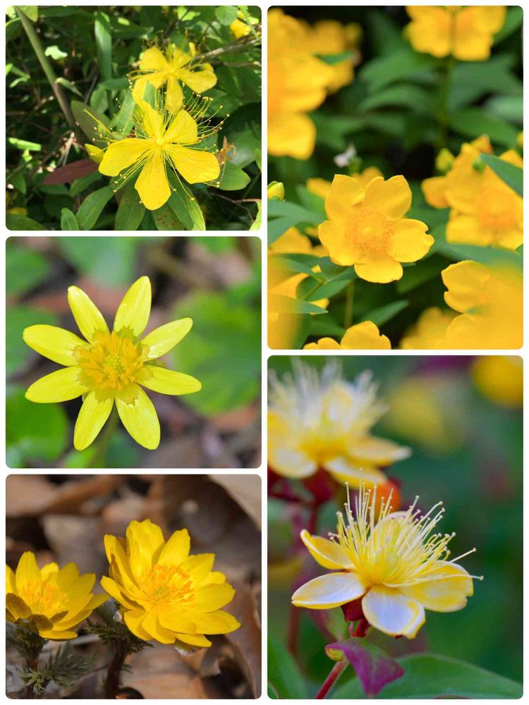 左うえから、ビヨウヤナギ、横、キンシバイ、下ヒペリカム、ヒメリュウキンカ、福寿草、かなと思います😀