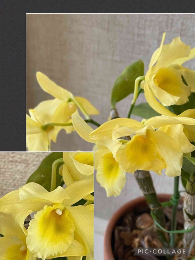 夫が何年も前からあるデンドロビウムの高芽を刺して育てて3年目、今年花をつけました。淡く優しい黄色の花色💛