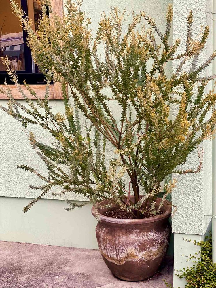 先端の蕾はミモザ系の黄色い花が咲くはずです🌼
