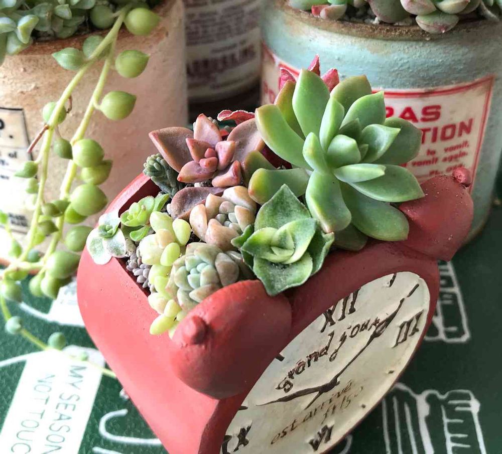 先日園芸店で見つけた時計の鉢にちまちま寄植えしました!