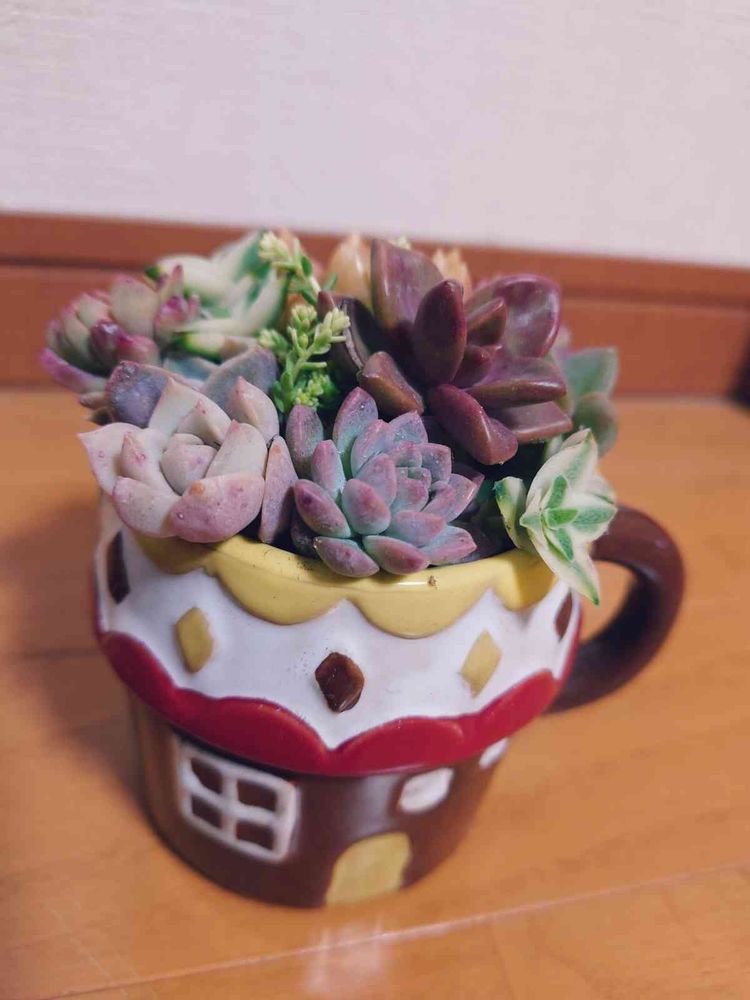 多肉を何に入れようかとおもったら買ってきて忘れてたマグカップ、ちょうど良かった😊🙆