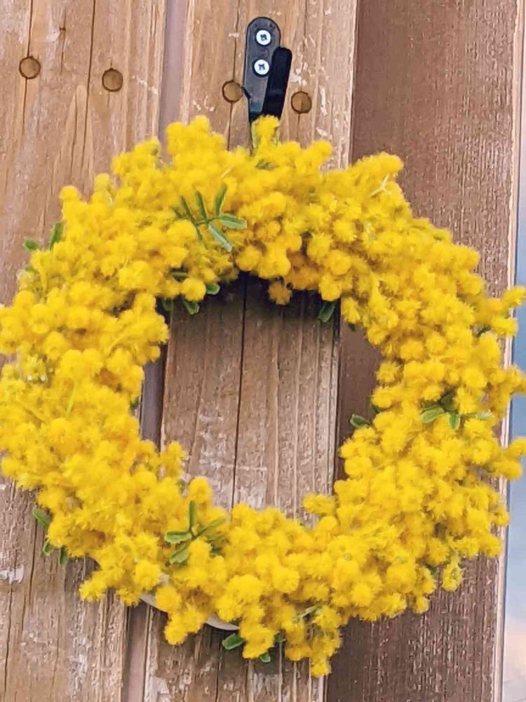 職場の近くの食堂の入口のドアにミモザの花のリースを飾ってました。