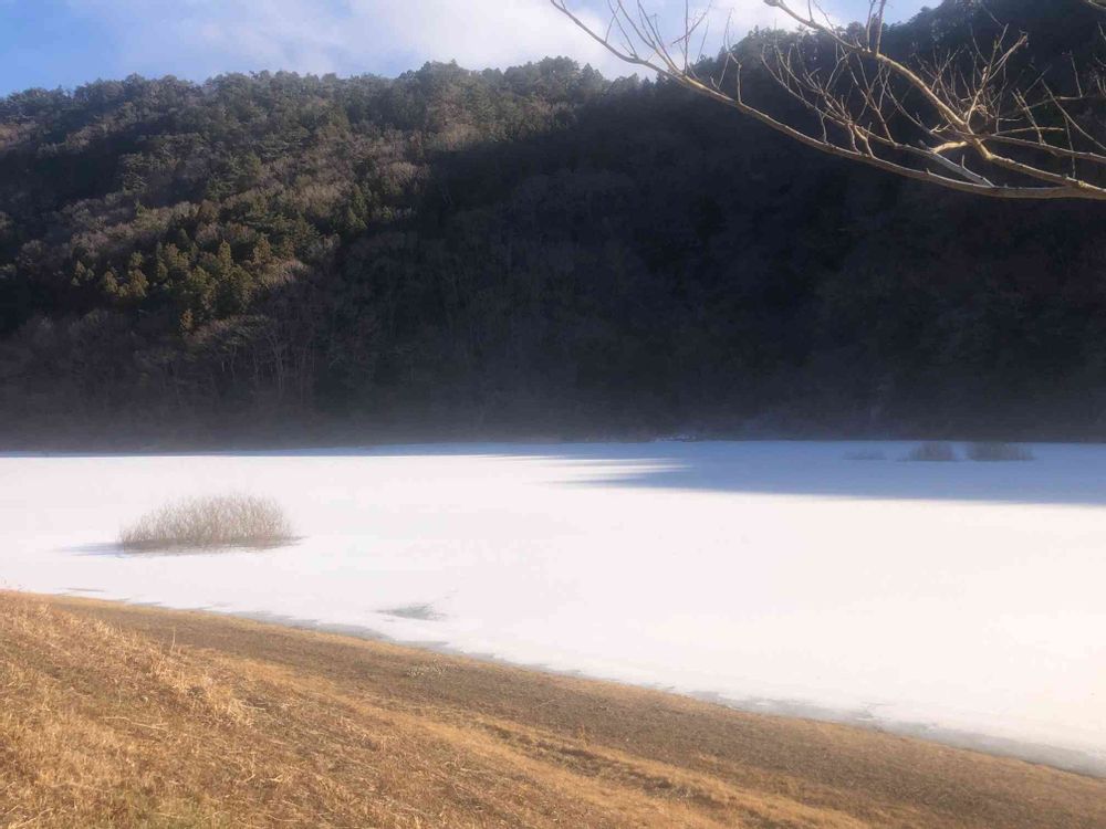 気温はプラスなんですけどねえ、湖は見事に凍ってます🧊 もち薄くて歩けるような氷ではありませんが…