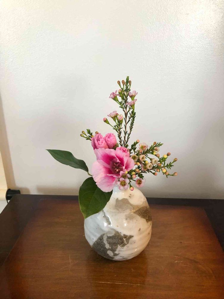そうなんです。雪が融けるイメージで選んだお花器。椿の代わりにレモンリーフとクラキアを、梅のイメージでワックスフラワーを使いました😆💕🌸