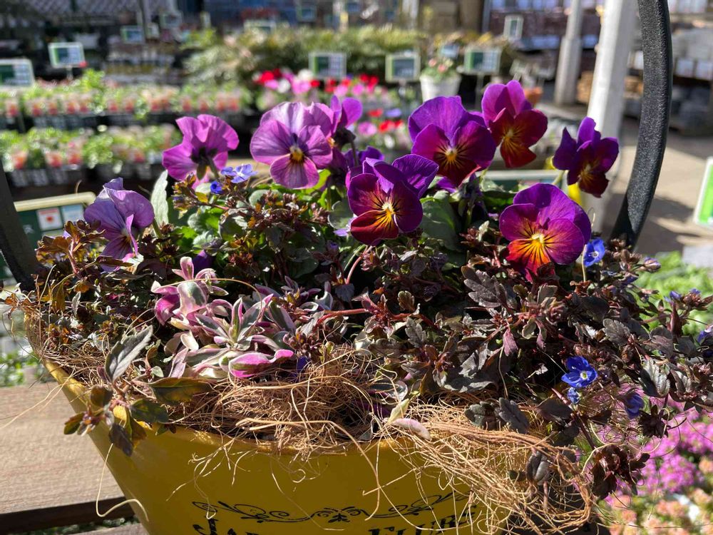 ちょっと写真の角度も🤳よくないし、ココファイバーもあばれちゃってますが😅とにかく久しぶりの日差し☀️に花が喜んでる寄せ植えです😃
