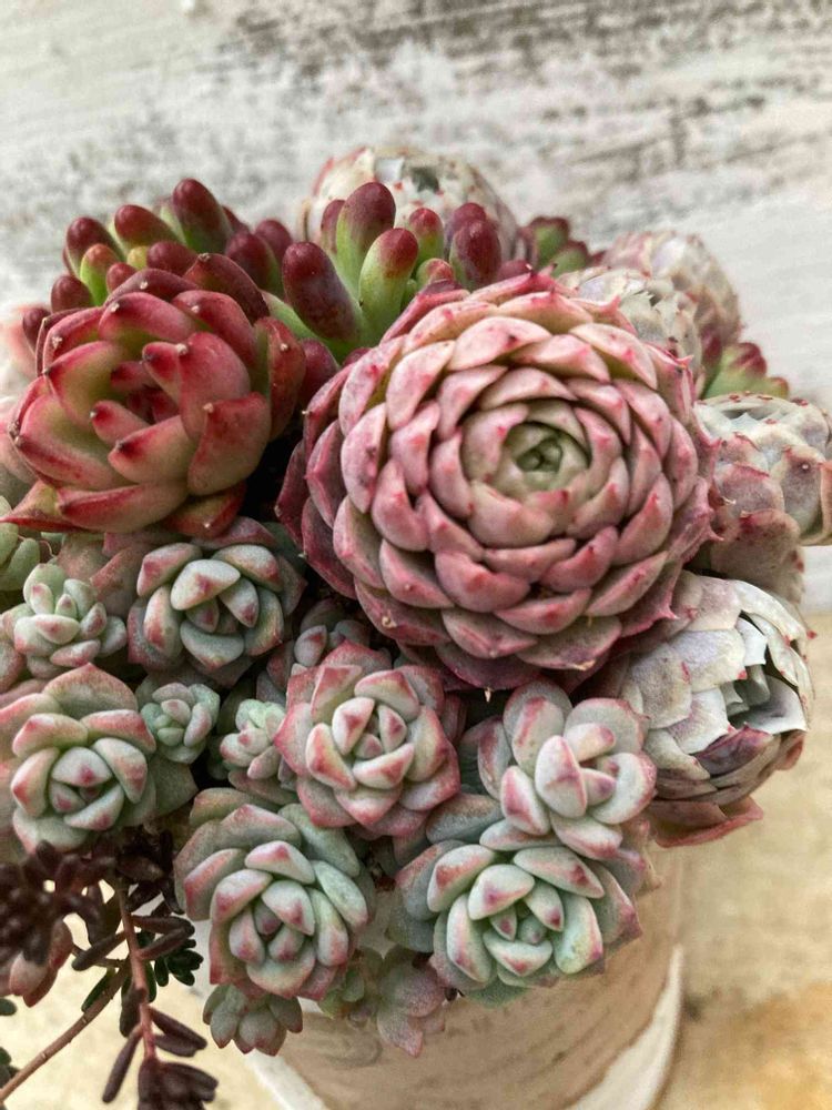 この寄せ植えは缶🥫の下半分は鹿沼大粒であとは培養土ですが寄せ植えするときは土を湿らせて山型にすると寄せ植えしやすいですよ❣️(苗も根付きかカット苗でも乙女心とか茎の長いのを使っていますよ!)