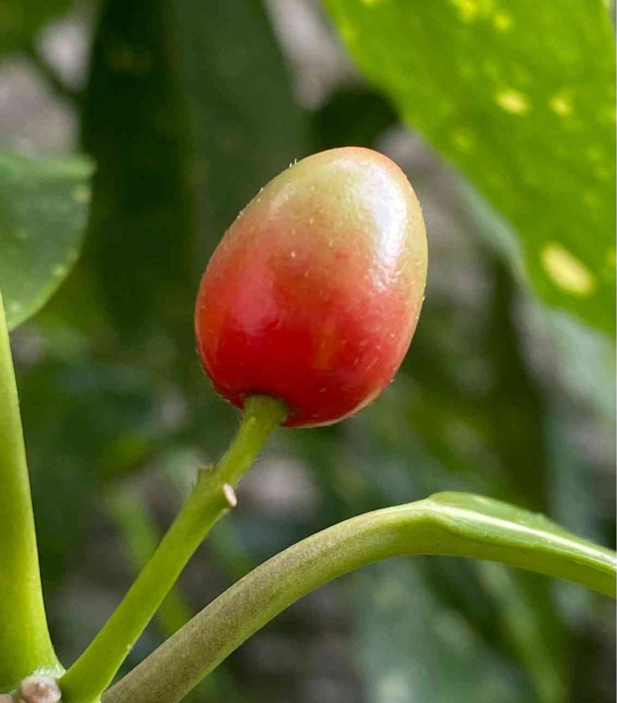 勤務先の中庭で出会った、斑入りアオキの実🍀