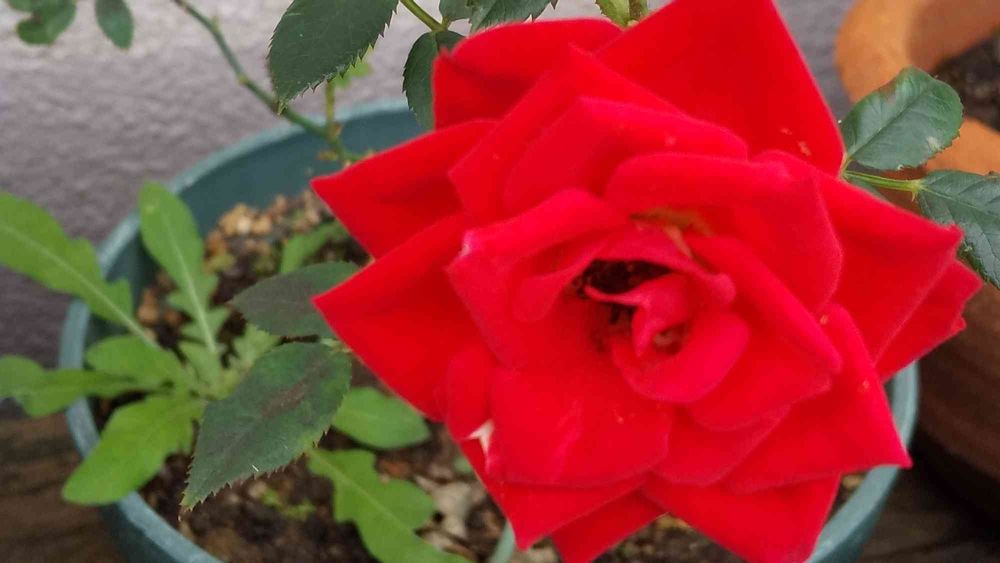 1つのポットに、5株入りのバラの苗木を、格安販売品でしたが、深紅の色が気に入っています😃