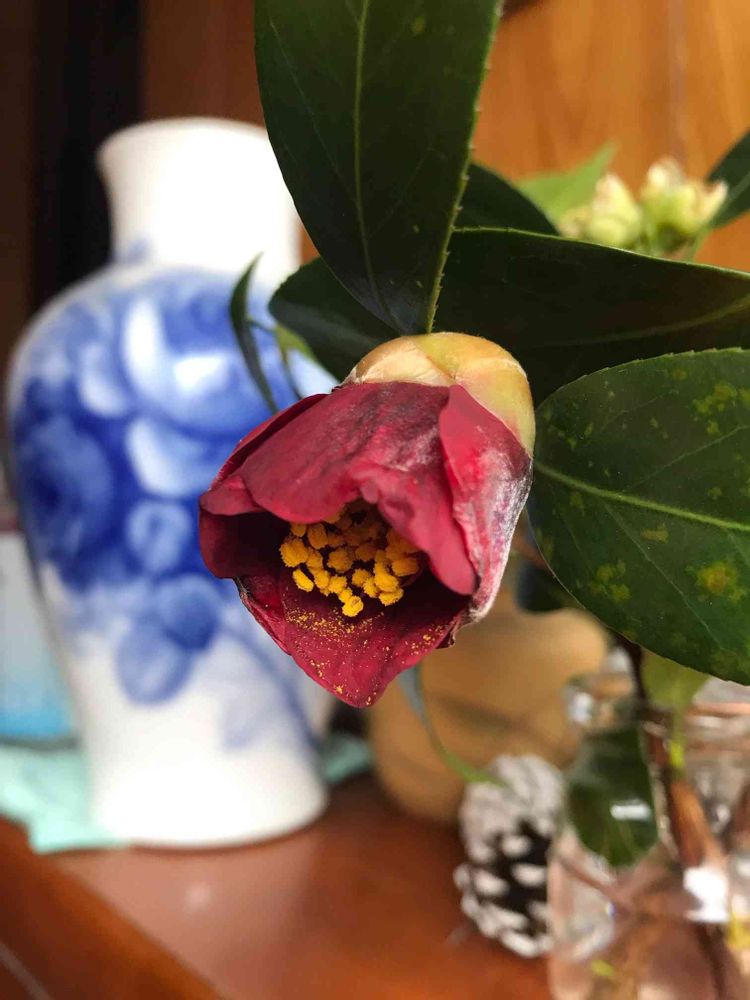 お正月過ぎ 咲き始めた黒椿もあまりの冷たさに蕾を固くしたので切り 玄関で咲くのを待とうと飾りました