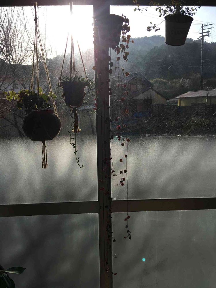 窓際に垂れ下がる植物をひっかけてカーテン代わり。そこまで目隠しになってない^^;