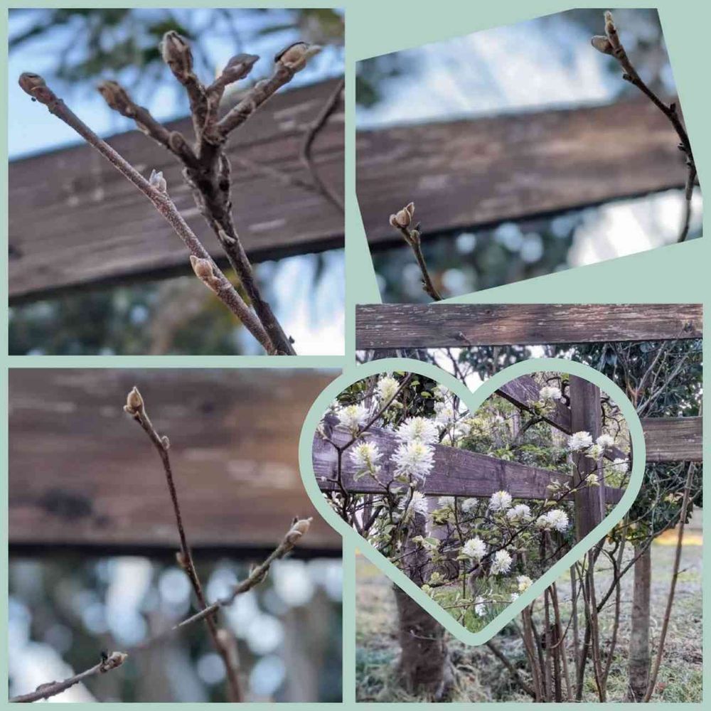 アプローチの白花マンサクの新芽が出ています。4月の白いふわふわのお花が楽しみです。