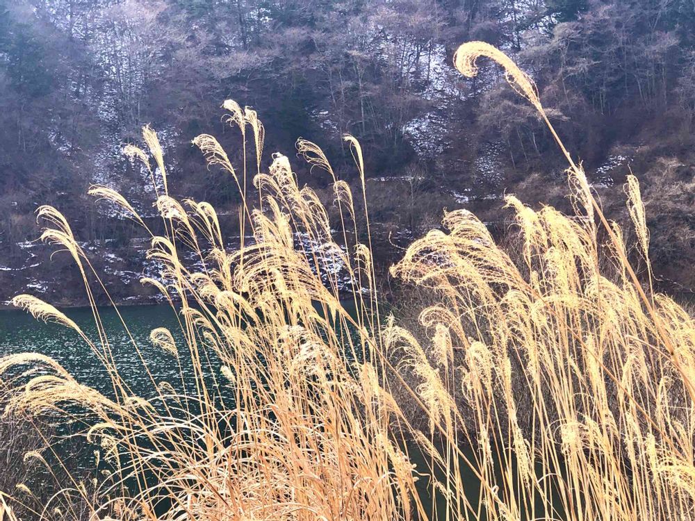 雪を遺した山肌、人気のないダム湖の湖面を背景にススキが靡いてます🌾