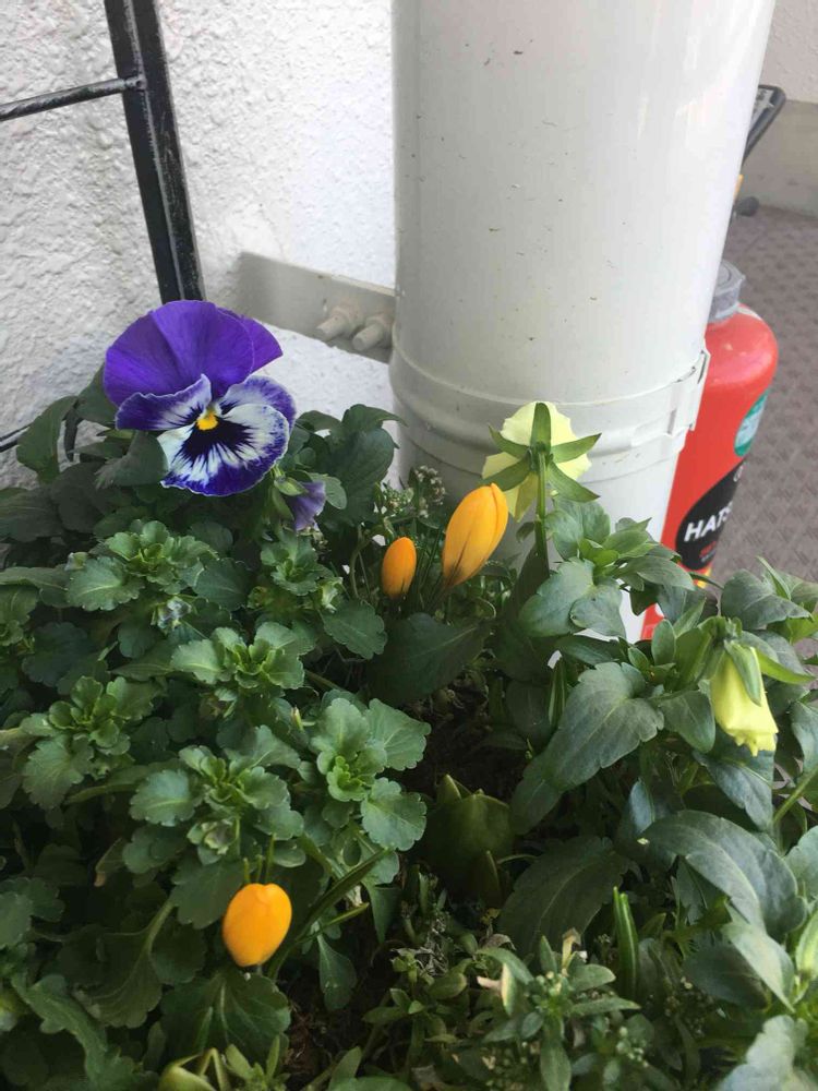 パンジービオラの中に、水仙、チューリップ、クロッカス、ムスカリの球根をミルフィーユのように重ねて植えています❣️
