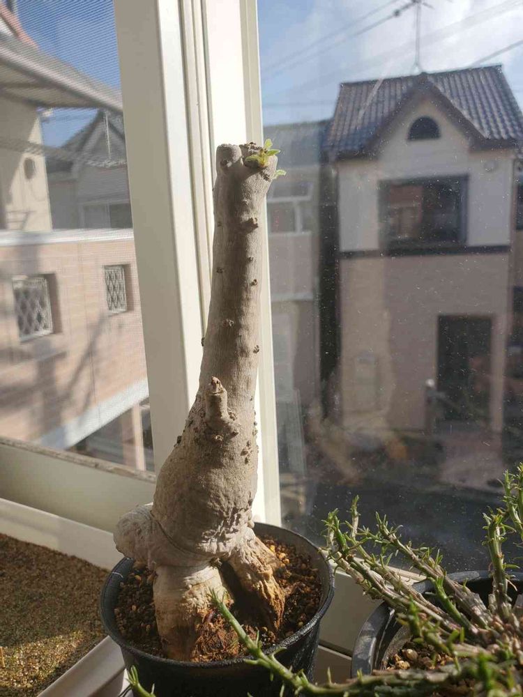 月一で休眠中は、幹にシワが寄り、芽出しで右側の根がミイラのようになりました。