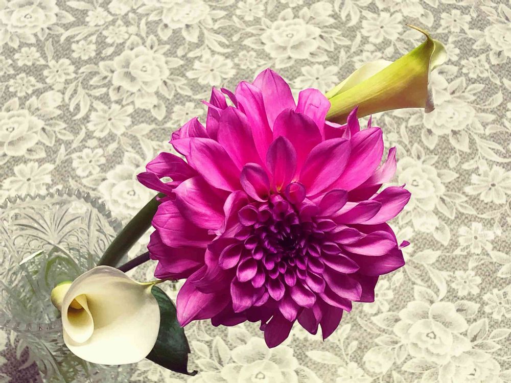 お花屋さんで直径15センチ越えの大きなダリヤを見て、買いたくなったけど、どうやって生けたら良いか分からず聞いたら、カラーと生けたらスッキリして良いのではと。
